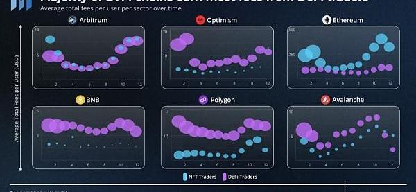 对于大多数EVM链来说,大部分费用收入来自基于DeFi的应用程序,例如DEX和衍生品平台。就Optimism、BNB和Avalanche而言,DeFi的总费用收入与基于NFT的应用程序之间存在相当大的差异。