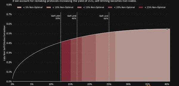 重新质押协议极大地扭曲了激励结构。如果像EigenLayer这样的协议甚至只能产生0.5%的名义收益,那么超过半数的自我限制变得不可行。选择在质押份额的33%以下自我限制,将使stETH持有者集合的潜在收益损失超过四分之一。