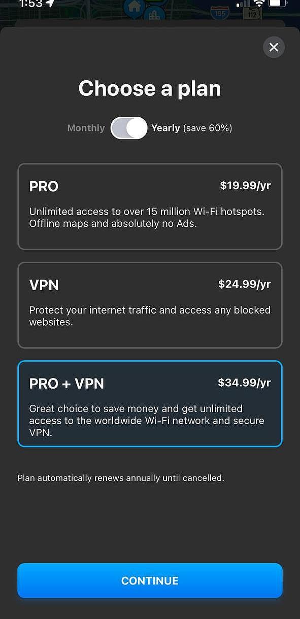 有三个付费订阅服务,“Pro”、“VPN”和“Pro+VPN”,并且按月付费和按年付费的价格还是有区别的。