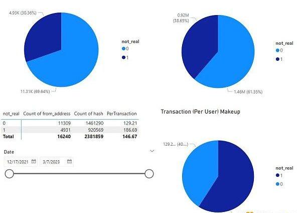 在本次观察的约?1?万?6?千个玩家地址中,非真实玩家地址约?4900?个,占比?30%?,正常玩家地址约?70%?。但仅仅占不到三分之一的非真实玩家却创造了?39%?的交互,人均交互次数是?187?次,是正常玩家的近?1.5?倍。