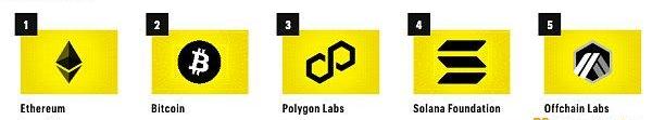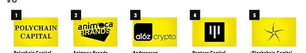 - 入围VC类别的公司有Polychain Capital、Animoca Brand、Andreessen Horowitz(a16z)、Pantera Capital和Blockchain Capital;
