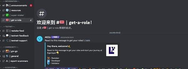 15.对了,还有一个地方可以操作一番。EigenLayer昨日晚间已开通了官方的Discord服务器,在其中的「get-a-role」频道点击前三个图标可直接拿到三个role。