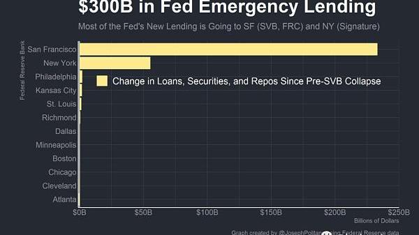 截至周三,美联储已经向银行系统提供了超过3000亿美元的有担保直接贷款——比全球金融危机以来的任何时候都多——以遏制硅谷银行(SVB)和签名银行倒闭的影响。超过119亿美元的贷款来自银行定期融资计划(BTFP),这是一项新设立的工具,允许银行以票面价格抵押政府支持的证券,以换取最多一年的贷款。然而,美联储的大部分贷款(2950亿美元)来自贴现窗口,这是美联储历史上为向银行提供紧急流动性而保留的抵押直接贷款工具。美联储为SVB和SignatureBank向FDIC旗下的过桥银行提供了1420亿美元贷款,并通过贴现窗口向私人银行提供了1520亿美元贷款。在这1500亿美元的私人借款中,有一家私人银行可能占了大部分——第一共和国银行,他们发表声明说,自硅谷银行倒闭以来,他们的贴现窗口借款从200亿美元到1090亿美元不等。