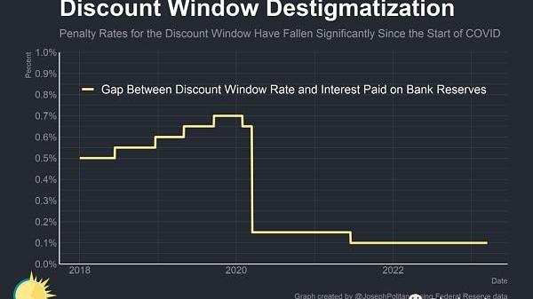 在2020年初的金融危机之后,美联储进行了几项改革,旨在鼓励更多银行使用贴现窗口,并减少从美联储借贷的耻辱感。首先,最长期限从隔夜延长到90天,使银行能够进行更长期、更灵活的借贷。其次,对于从贴现窗口借款收取的“惩罚利率”大幅降低,以使从美联储借贷的成本不再显著高于市场利率——截至今天,贴现窗口的主要信贷利率仅比美联储支付给银行准备金的利率高出0.1%,而在疫情之前为0.7%。