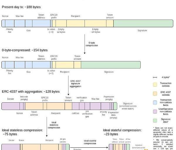 或者,EntryPoint合约可以使用签名聚合器。抽象帐户信任此合约以创建UserOperation签名,该合约还被Bundlers用于创建一个“aggregateSignsignature”,它是多个UserOperation的签名。这将众多签名转换为一个值,压缩验证所需的数据。这对于占用大部分数据成本的rollup来说尤其有用。