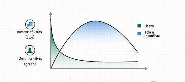 无论如何,在过去,用户放弃发行代币地项目的历史趋势是存在的,这个陷阱来自于这样一个事实,即创始人认为通过代币激励获得的用户具有粘性。在理想条件下,代币奖励与产品用户之间的图表应该如下图所示: