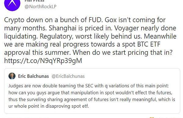 交易量从1月18日的高点继续呈下降趋势,shapella之后意外的巨大奖励抛售压力可能会破坏撤资是净利好的整个叙事,导致可能考虑过出价的交易员感到担忧,并创造一个自我实现的下行螺旋预言。