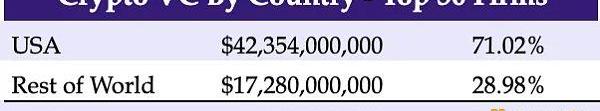 美国在加密货币风险投资领域占据主导地位,至少在按基金规模排名前50的公司中是如此。