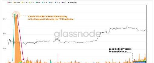尽管内存池出现拥塞,但与FTX暴雷相比,当前在内存池中等待处理的费用的总价值就显得微不足道了。当时,大部分费用压力的来源来自10-50?sat/vByte的交易,很可能是因为恐慌的卖家在交易所存入货币、追加保证金,以及从交易所提款转为自我托管。