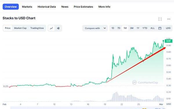 我们此前在《比特币「新文化」运动促Web3繁荣,推动牛市三大新叙事》曾提出:加密市场似乎正在进行一场被命名为比特币「新文化」的运动。在这个过程中最值得关注的就是近期爆火的NFT协议Ordinals和Nostr协议。而与比特币「新文化运动」相关的概念币中STX无疑最为受市场热捧。在大盘普遍比较低迷的情况下,STX逆市上涨,据Coinmarkcap行情显示,截止3月1日10时,STX现报0.97美元,从2月18日0.32美元开盘价计算,目前涨幅达203%。