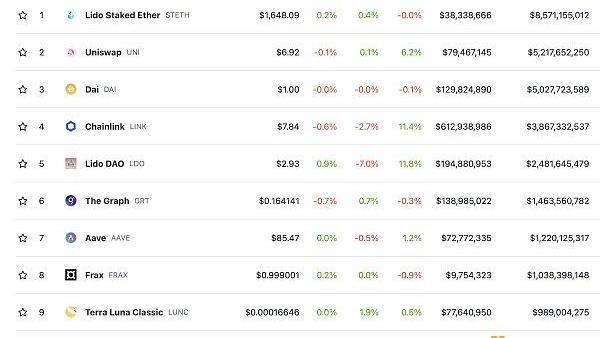 DeFi项目锁定资产前十排名及锁仓量数据来源:defillama