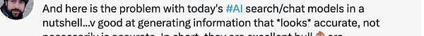 也有推特网友评价说,这也正是如今的AI研究和语言模型共有的问题:它们非常擅长生成*看起来*准确的,但其实并不准确的信息。概括来说,他们就是很牛的扯淡人。