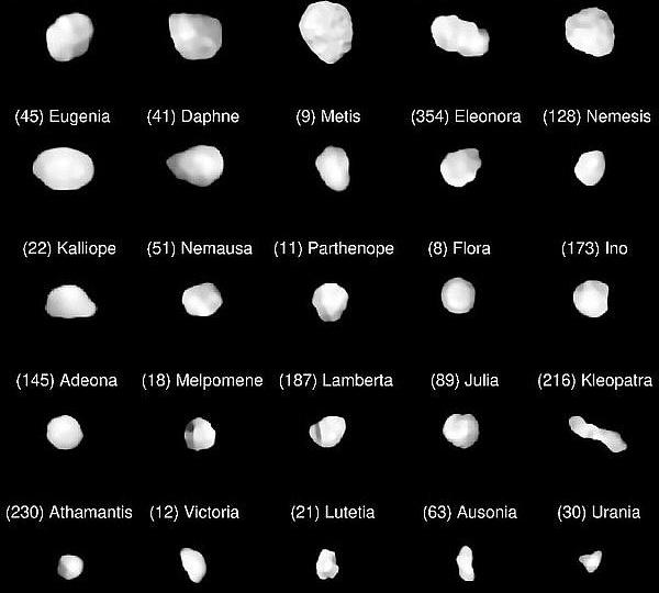 大量直径为100至210公里的小行星的图像,按比例绘制。