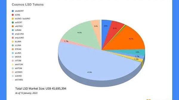 随着LSD代币的普及和更多Cosmos参与者利用其经济效益,LSD代币的数量和相关价值正在稳步上升。下面的图表和表格总结了Cosmos中LSD市场的现状。