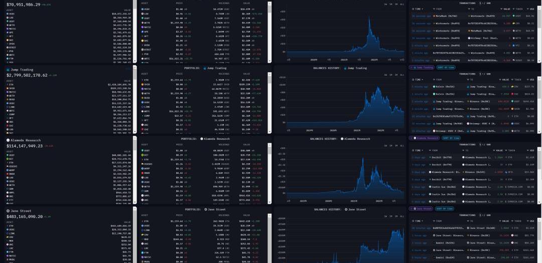 Arkham收集了市场上主流的做市商地址,归集成为实体,方便用户做查询。以实体分析为例,如下图,我制作了一个做市商对比的看板。看板内容包括Wintermute、JumpTrading、Alameda和JaneStreet四家做市商的资产、资产组成、资产历史曲线以及近期操作。