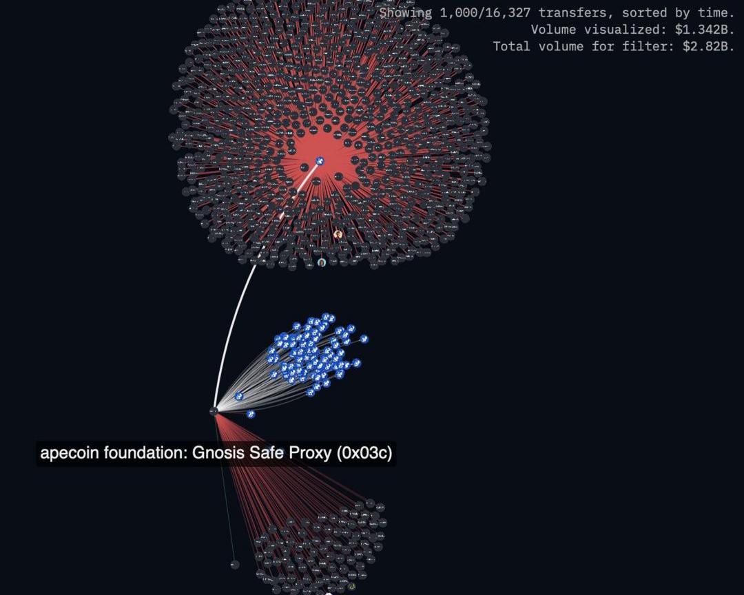 图谱是一个将链上地址关联的可视化工具,类似地输入地址或者实体名称,就可以自动生成图谱。比如我想追踪APEcoin的初始分布,如下图所示,上部分是空投地址,中间的是由Coinbase管理的基金会钱包,下方是一些未被标记的地址。