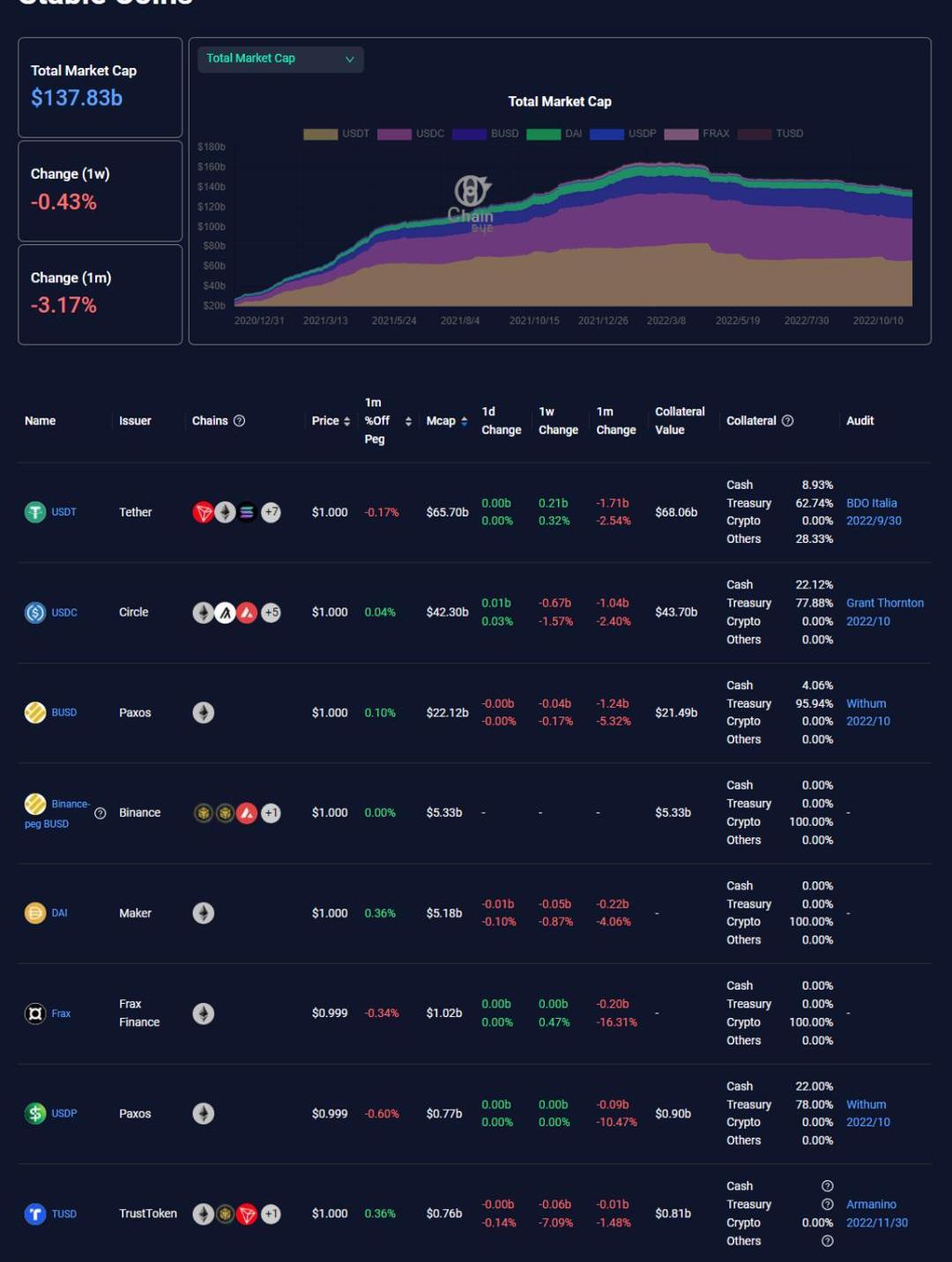 对于市面上主流的稳定币,Chaineye提供了一个市面上最全面的对比看板。内容包括稳定币的总市值,各类稳定币的发行商、部署链,是否有脱锚情况,稳定币的抵押物构成,是否经过审计以及详细的审计报告均有列出。