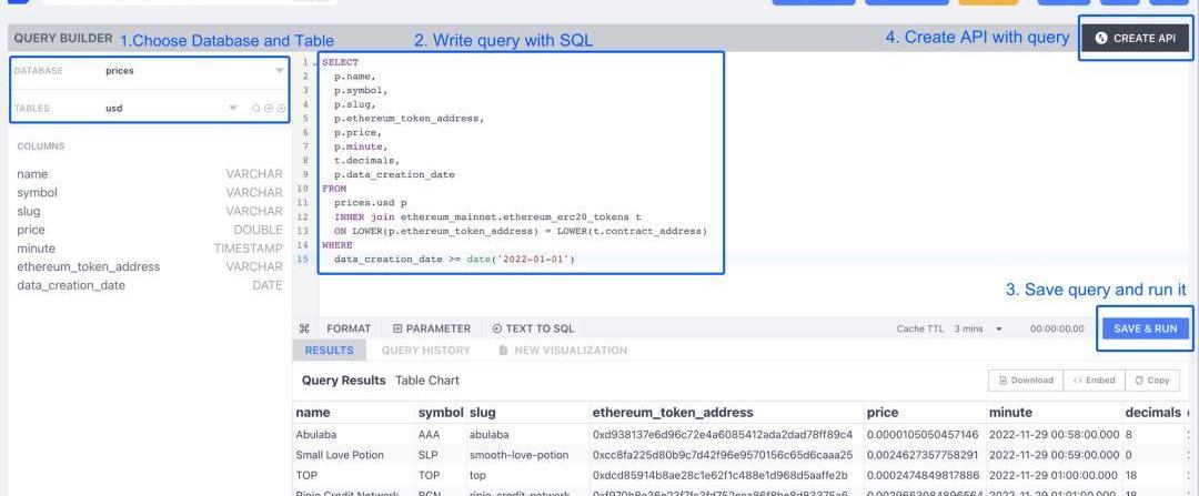 自定义API是GraphQLAPI端点,用户可以写完SQL查询,通过ZettaBlock的API构建器十分方便地构建。定制的GrahQLAPI是实时的,具有成本效益,并且可以处理高QPS,非常适合为面向消费者的dApp提供API支持。