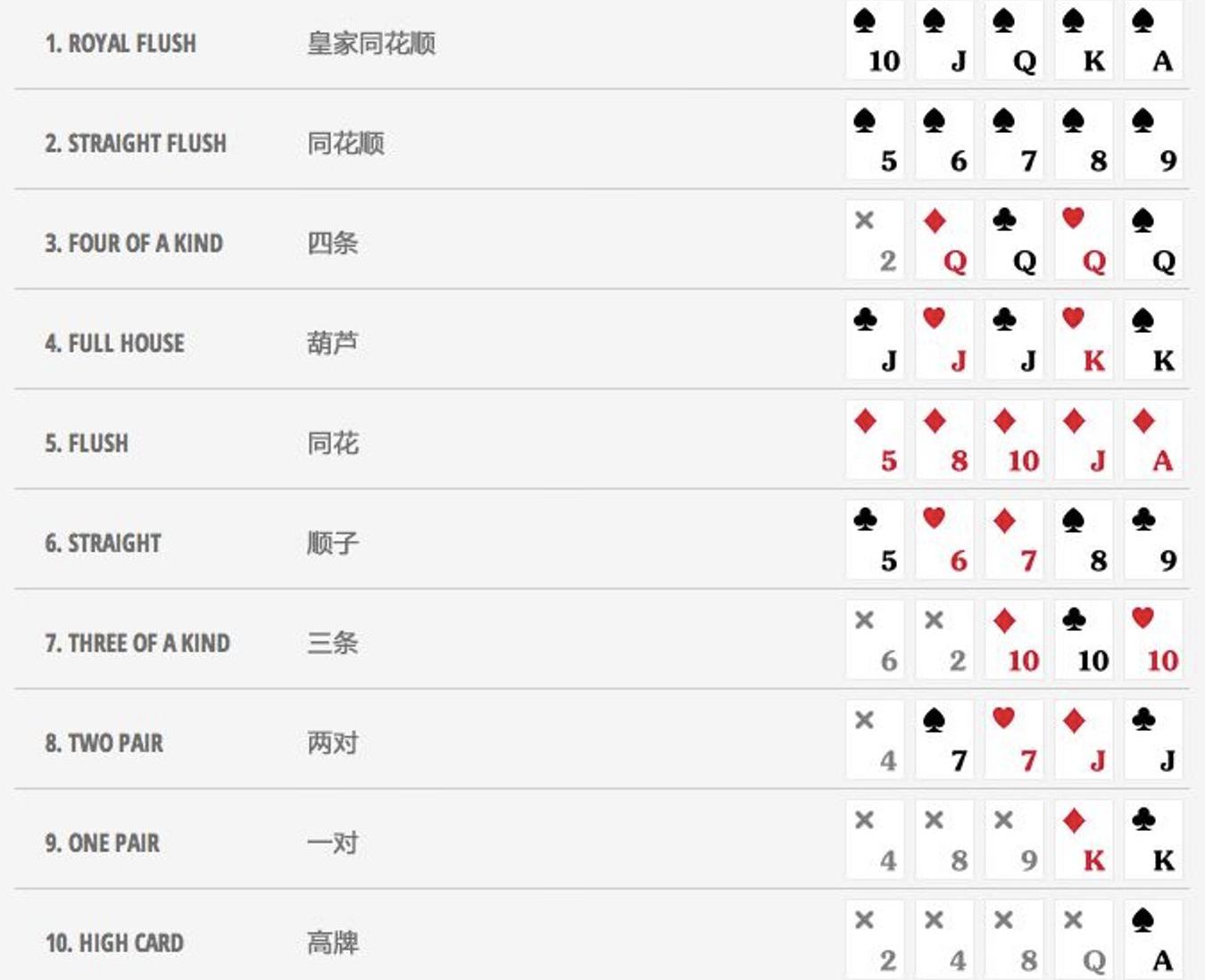 德州扑克一共52张牌,没有王牌。开始的时候,每个玩家有两张面朝下“底牌”,接着,荷官会陆续发出5张朝上的公共牌。经过所有押注圈后,若仍不能分出胜负,游戏会进入“摊牌”阶段,剩所有的玩家亮出各自的底牌以较高下,最终牌面大的选手获得最终胜利。牌面大小组合如下图: