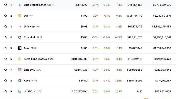 DeFi总市值及前十代币数据来源:coingecko