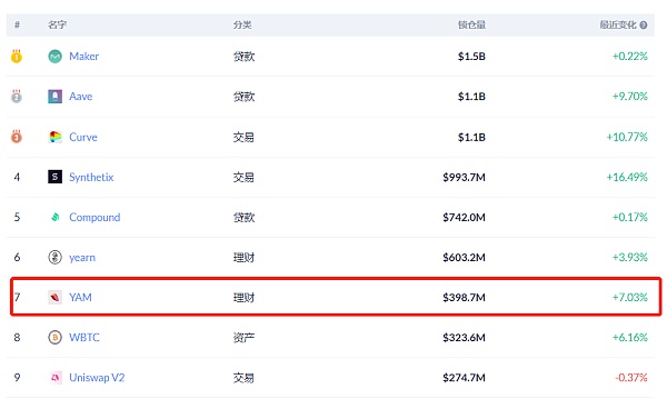 根据debank的数据显示,YAM的锁仓量排在第7位,位置很靠前。