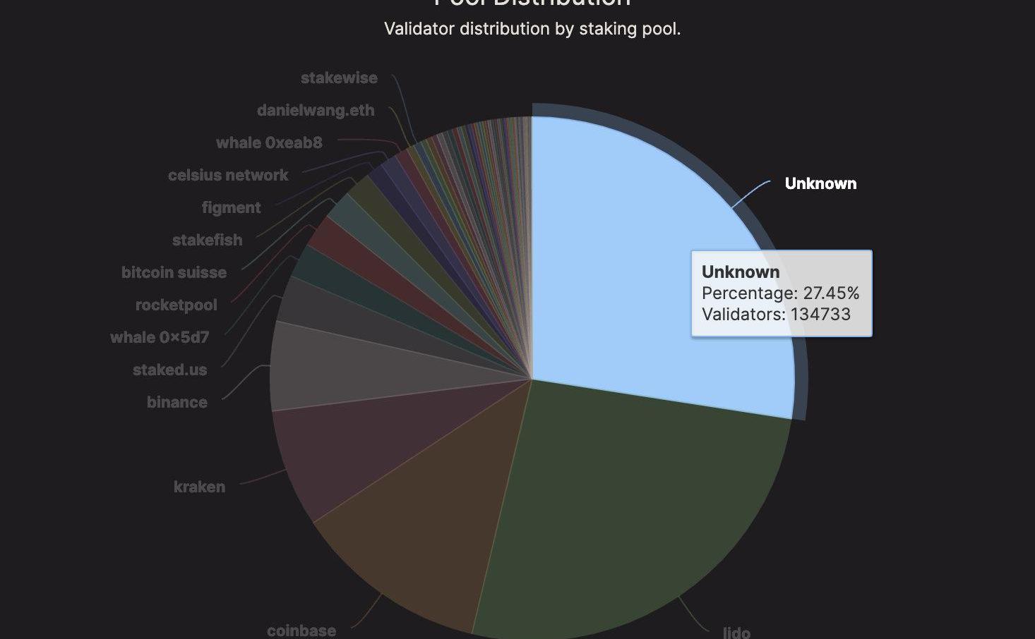 全部验证者节点中,未识别的占比为27%,其余均为大型质押服务提供商如Lido、RocketPool,或是交易所、矿池等组织。