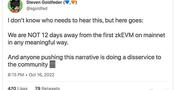 但我确实认为,我们应该降低一些期望。我们实际上预计zkSync将在今年年底全面推出Alpha版。在此之前,任何用户都无法进行外部跨链。Arbitrum的联合创始人StevenGoldfeder分享了他对zkSync所描述的时间线的怀疑。