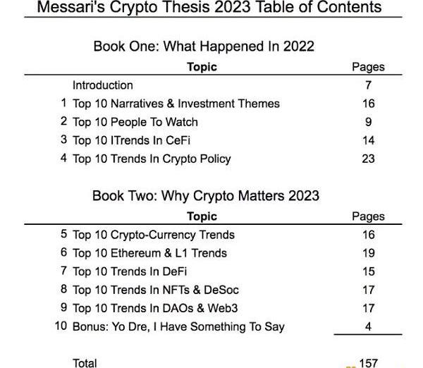 Messari的「2023年加密货币年度论文」共有157页,虽与2022年的杰作相比略有减少,但仍是业界对加密生态系统最令人印象深刻的概述之一,是任何加密爱好者的必读之作。