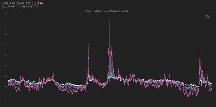 ?2022?年年初至今BTC期权隐含波动率变动,截至?2022?年?11?月?30?日。来源:ADderivatives