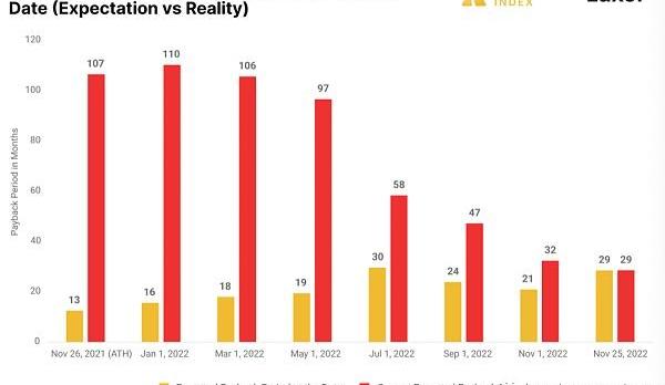 不出所料,现在正处于2022年购买矿机的最佳时机。预期投资回报周期为29个月,尽管这在历年看来仍然较长。有趣的是,如今购买矿机的预期回报期比2021年11月26日的预期回报期高出两倍之多。这是由于当时挖矿经济的臃肿和不可持续,关于这两点我们将在下文提及。