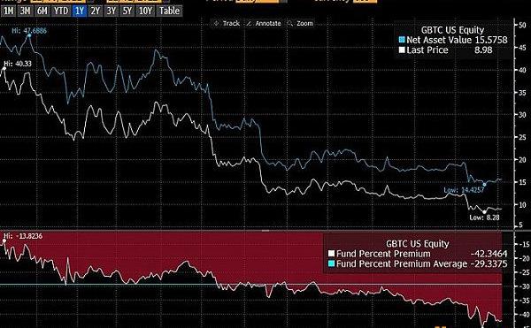市场对Genesis担忧、以及现货比特币ETF延迟批准,导致灰度GBTC大幅折价