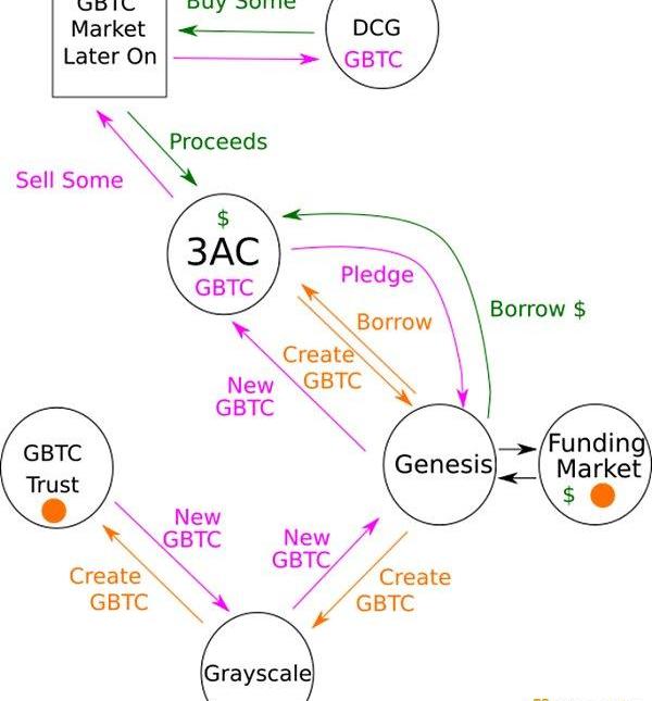 那么到这里我们先需要了解一个模型,由于GBTC与BTC的价格存在溢价,那就会出现获利的机会,再结合“借”“化”“发”为一体的DCG集团,就会产生如下模型。