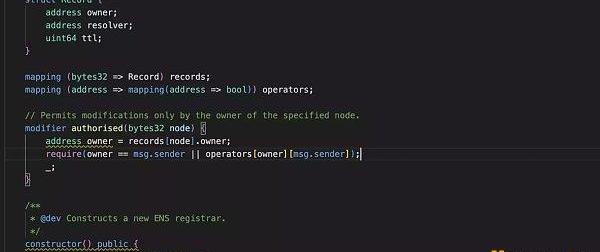 除了注册表信息records维护,合约还维护owner的委托管理者信息operators,owner可以通过添加设置委托管理者地址来共同管理域名信息合约中相关管理设置接口,都会通过修饰器`authorised(node)`来限制调用权限;该修饰器将判断该接口的交易请求者是否为当前域名的owner,或者委托管理者地址,保证了仅有域名的owner或委托者才有创建下一级子域名的权限。同时这里部署初始化的时候将`」」`根域名的node的owner设置为部署者,只有这样,部署者才能将根域名的owner设置给Root合约根合约。