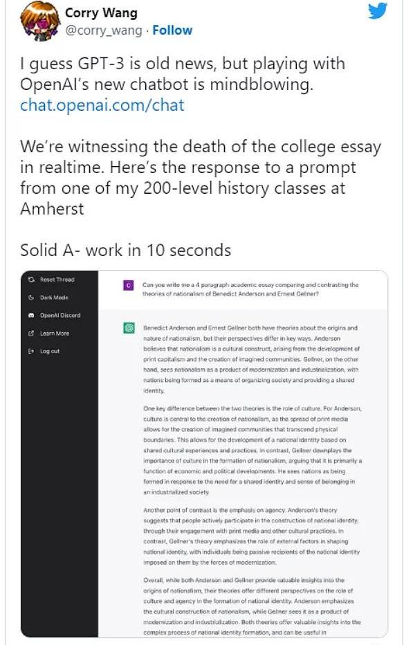 ChatGPT还可以写一些基本的学术文章,如下面这篇大学历史论文,比较两位学者的民族主义理论: