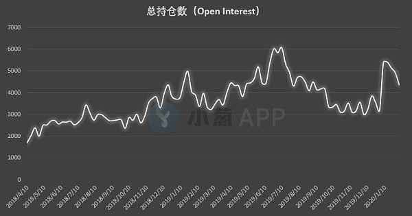 总持仓(未平仓总量)数量在最新一期数据中自4917张进一步大幅下降至4367张,前期连创新高后出现了连续第三周的回调,而在近两周的大幅减仓过后,目前该数据已经创出新年以来的新低水准,显示年初暴涨的市场参与热度已经明显冷却。