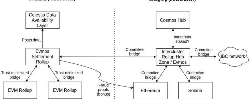 作为强制结算rollup方案中的一种,Cevmos尝试通过为rollup提供专门的结算层来实现成本的降低与效率的提升。具体来说,在这个堆栈中,Cevmos将作为一个结算层,将以Evmos为基础,在其之上构建EVM的递归rollup。
