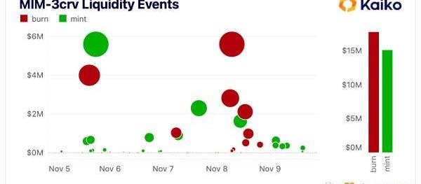 这种影响也已经蔓延到了以太坊。人们很快意识到,FTT是抵押稳定币MIM的一个主要支撑。链上调查显示,其中大部分是Alameda的头寸,当FTT达到6美元时,它将被清算。在这个消息中,MIM的挂钩开始动摇,尽管该团队很快宣布,它正在与Alameda合作,以减少他们的贷款规模。随后,MIM回到了稳定的挂钩,并没有看到其CRV池强烈资金流出,过去几天的MIM销毁量只比铸造多一点。