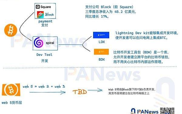 围绕比特币,JackDorsey在Block公司进行了组合式布局,其中支付公司Block做比特币支付,旗下Spiral负责比特币闪电网络开发套件LDK和比特币开发套件BDK,以及TBD进行建立在比特币货币层上的Web5。