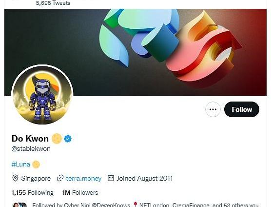 在DoKwon的推特个人主页上,他的头像是这样一幅形象:一个类似托尼·史塔克钢铁侠造型的动漫卡通人物,戴着镶满六颗能量宝石的灭霸手套,脸上则是极像机械战警一样的面罩。其背后是黑色夜空中在黄色火焰上升腾而起的显目LUNA图标。