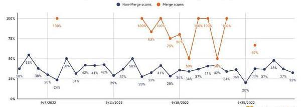 在以太坊合并当天,该局的收入大幅飙升,取价值超过90.5万美元的ETH,而所有其他以太坊局只取了不到7.4万美元。然而,欺诈高峰很快回落在几天内恢复到正常水平,与合并相关的局几乎在9月底消失。