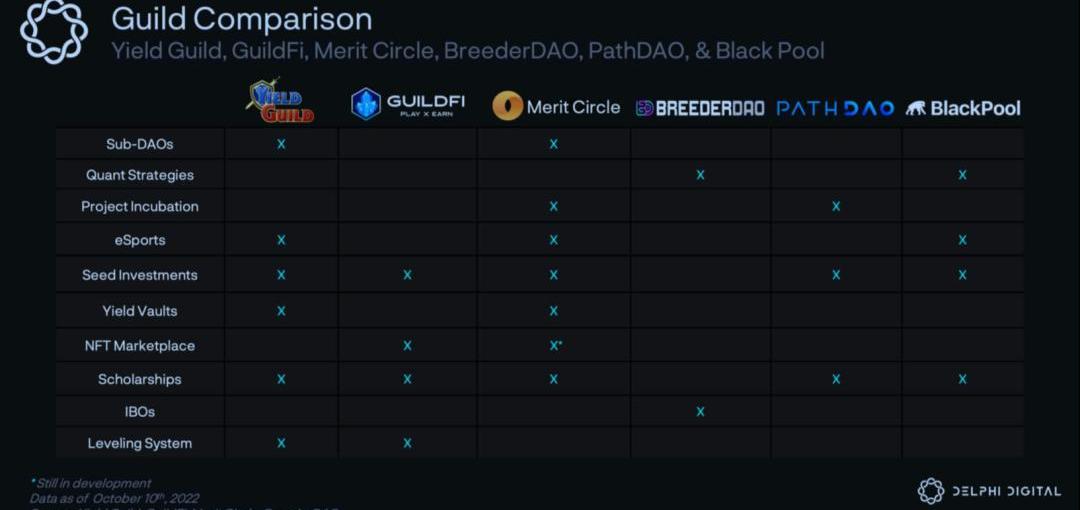 这些公会有一些共同的基本特征。在实际意义上,公会是一组围绕共同利益、价值观和目标而组成的个人,以实现成员的共同利益。在crypto游戏行业,游戏显然是他们的重点。它们的不同之处在于采用的具体特征和策略——上表列出了其中的一些。