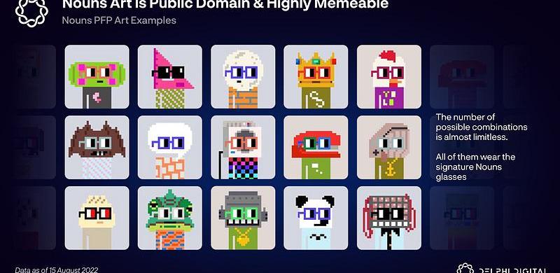 让我们不要忘了艺术性。Nouns文化的精髓在艺术性中得到了提炼和捕捉,这使它与投资DAO不同。这些是32×32像素的角色,非常容易meme化。Nouns没有定义的稀缺性,每个新Noun的特征完全是随机的。方形的Nouns眼镜是Nouns在视觉上最容易识别的特征,而它本身就是一个文化艺术品。