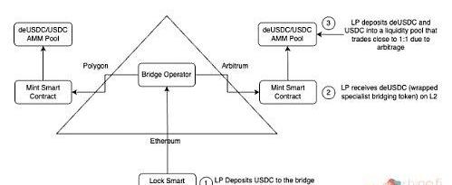 一些跨链桥协议将「烧毁和铸造」模型与AMM流动性池相结合。该流动性池可以包含两个或更多的资产,其中包括特别铸造的跨链资产。重要的是,就像Lock和mint桥一样,这种模型有助于在Layer2与其他链之进行快速资产跨链以及返回源链。deBridgeFinance和HOP属于这一类。当用户将ETH锁定在一层以太坊上时,deBridge会在Arbitrum和其他链上铸造特定的跨链桥通证。
