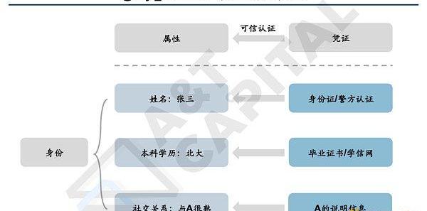 因此我们可以看到,一个身份,是由许多个属性组成的,例如刚才张三对自己的陈述中,所涉及的姓名、出生年、学历、社交圈等属性。但是,如果没有相应具体的凭证,这些属性是没有可信度的,而多数应用场景不会去采纳一个没有可信度的数字身份。由于在Web3中,一个身份的属性来源更加多样、潜在使用方更加广阔,难以找到一个中心化的总担保方,因此对每个属性的凭证验证就显得更加突出。