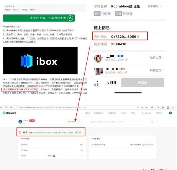 当然,也有可能我的藏品只是个例,毕竟天下没有白吃的午餐。巡视完大平台,诸多小平台又怎样呢?不看不知道啊,一看,嗯,我只能感叹牛蛙牛蛙了。先看看数藏界的网红选手iBox。其成立以来也是争议不断,不过,这都不是我关注的重点。打开软件,找到一款在售藏品,乍一看,合约地址,发行记录都有。但当我去验证的时候,问题来了,iBox的藏品是发在哪条区块链上来着?
