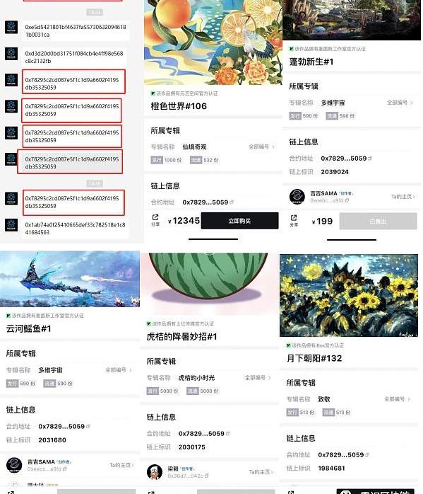 万万没想到,第一个就中奖了,又一个查无此人,更不要说所谓的售卖记录了。我不信邪,陆续又抽查了平台市场上的多个藏品,有趣的事情出现了,十不存一。也就是说,十个藏品里面,九个都查不到。还有一个有趣的事情,是我查证的时候发现的,看图↓盲生,发现华点了吗?没错,这些查不到的藏品,合约地址一毛一样!当然,作为一个严谨的圈内人,我咨询过技术,结论是如果是1155合约的话,也不是不行。那么问题来了,iBOX是发在哪条链上来着?