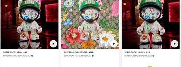 去年GUCCI与Superplastic合作推出了SUPERGUCCINFT系列,具体玩法上,Superplastic将旗下数字形象Janky&Guggimon整合GUCCI经典ICON打造成NFT及相对应的陶瓷潮玩公仔。