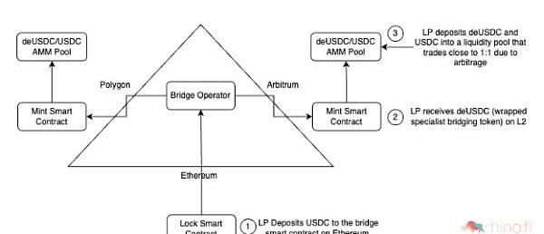 一些跨链桥协议将“烧毁和铸造”模型与AMM流动性池相结合。该流动性池可以包含两个或更多的资产,其中包括特别铸造的跨链资产。重要的是,就像Lock和mint桥一样,这种模型有助于在Layer2与其他链之进行快速资产跨链以及返回源链。deBridgeFinance和HOP属于这一类。当用户将ETH锁定在一层以太坊上时,deBridge会在Arbitrum和其他链上铸造特定的跨链桥通证。