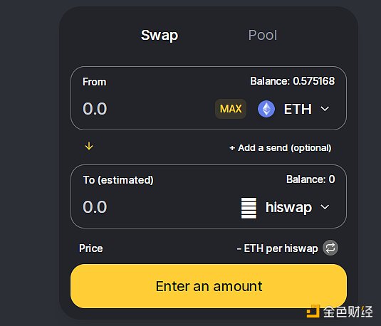 3、像Uniswap一样,Hiswap交易主界面提供交易(Swap)和资金池(Pool)两项功能。