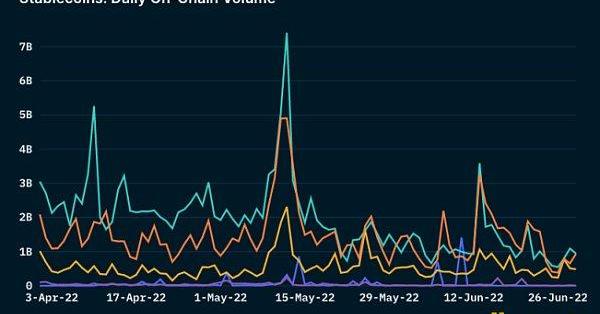 接近季度末,USDT、BUSD和USDC的日链上交易量比较接近,USDT交易量自峰值以来下跌了87.29%,而BUSD和USDC交易量分别下跌了80.93%和79%。还值得注意的是,TrueUSD在6月初曾达到1.4b美元的峰值,但在本季度末只有大约100万美元,下跌超过99.93%。